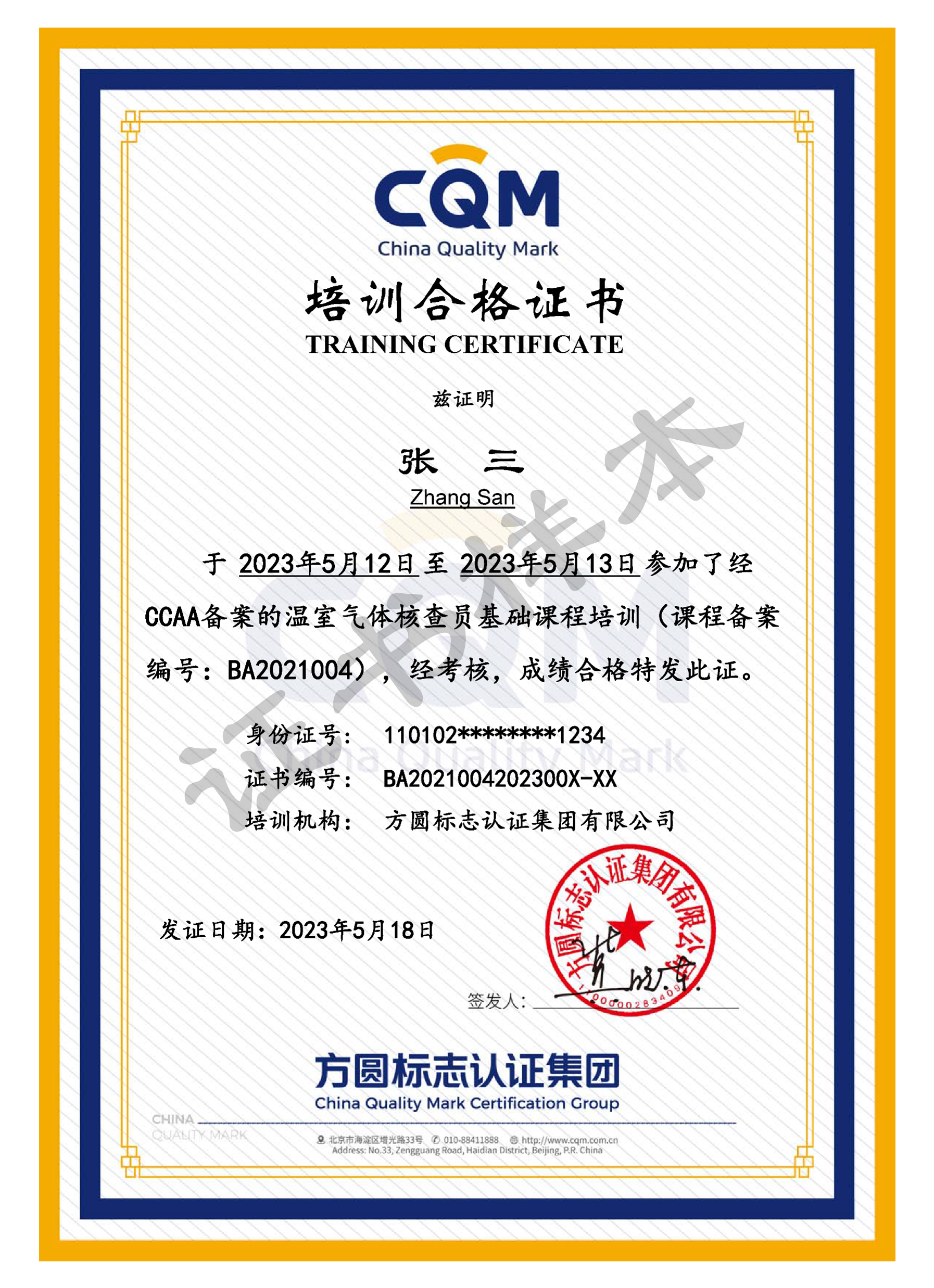 中国认证认可协会备案的《温室气体核查员基础课程培训合格证书》样本