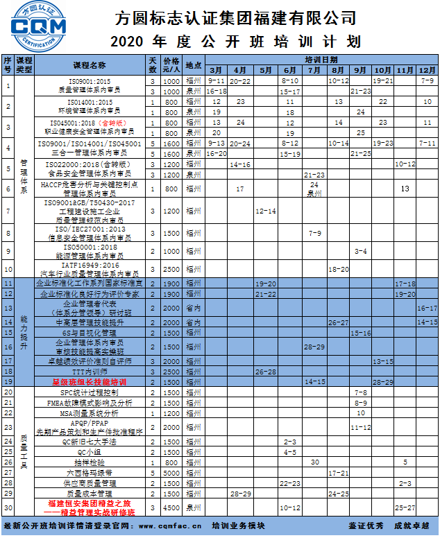 方圆福建2020年公开班培训计划(1月-12月)