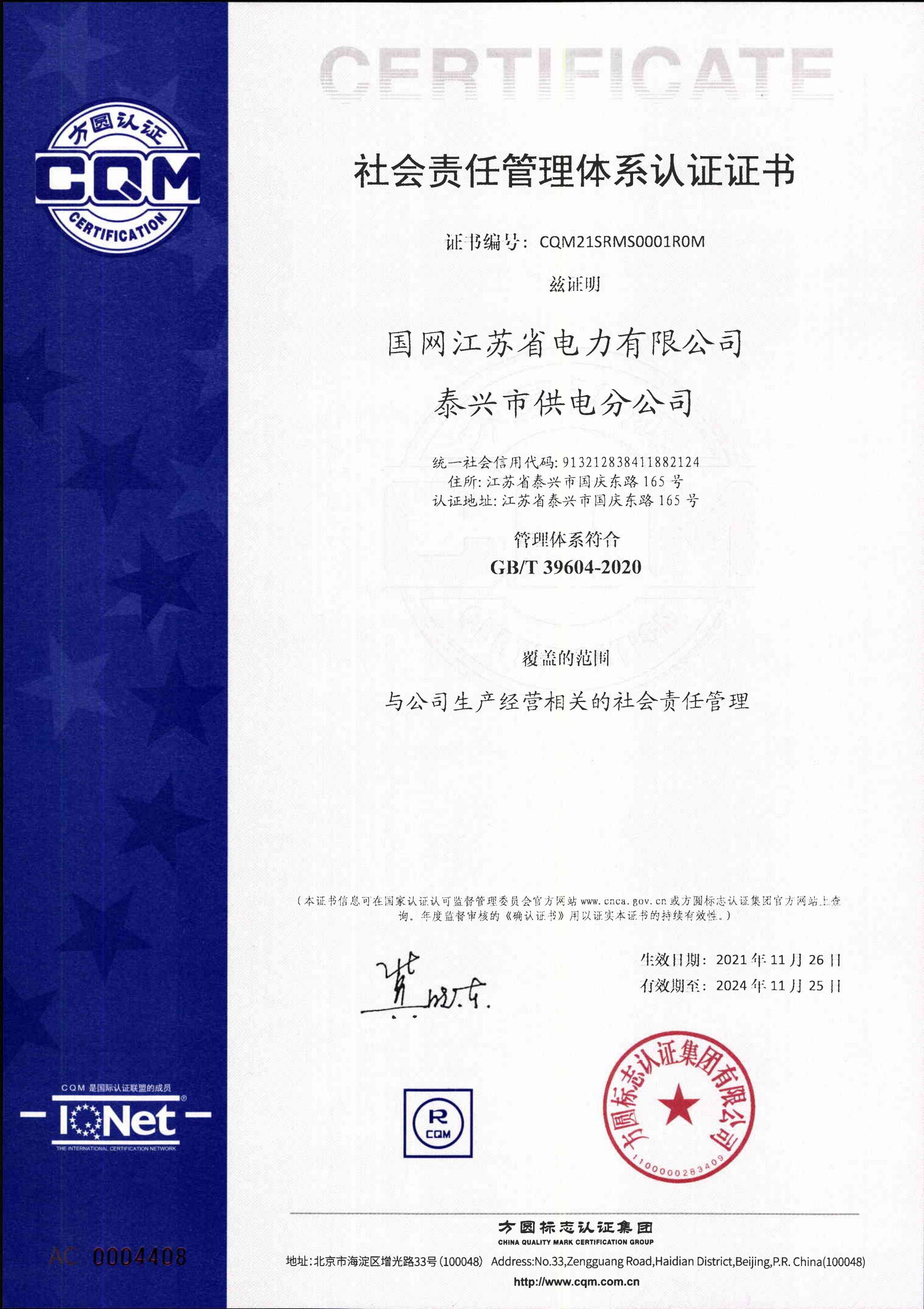 2021年11月,方圆标志认证集团对国网江苏省电力有限公司泰兴市供电分公司实施了社会责任管理体系认证审核,审核组对国网泰兴市供电分公司系统化地开展社会责任管理工作、推行全面社会责任落地管理、社会责任绩效等方面给予高度评价,并于2021年11月26日颁发了方圆标志认证集团首张社会责任管理体系认证证书,开启了方圆集团推动我国社会责任管理体系认证工作健康有序发展的序幕。