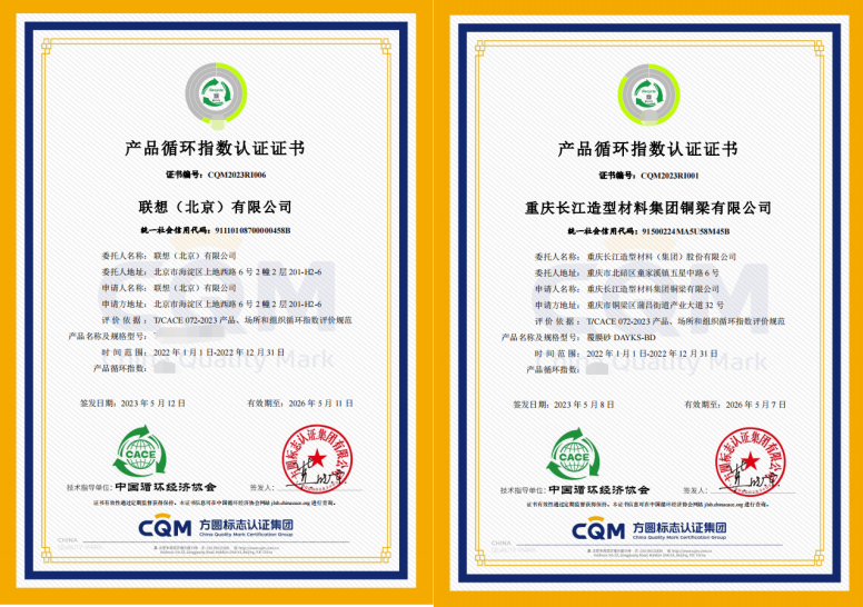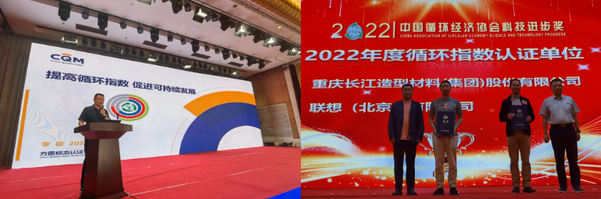华体会(中国)联合中国循环经济协会在“科学技术奖颁奖盛典”环节向联想(北京)有限公司、重庆长江造型材料集团铜梁有限公司颁发了首批产品循环指数认证证书;并在主题报告环节做了《提高循环指数 促进可持续发展》演讲介绍。