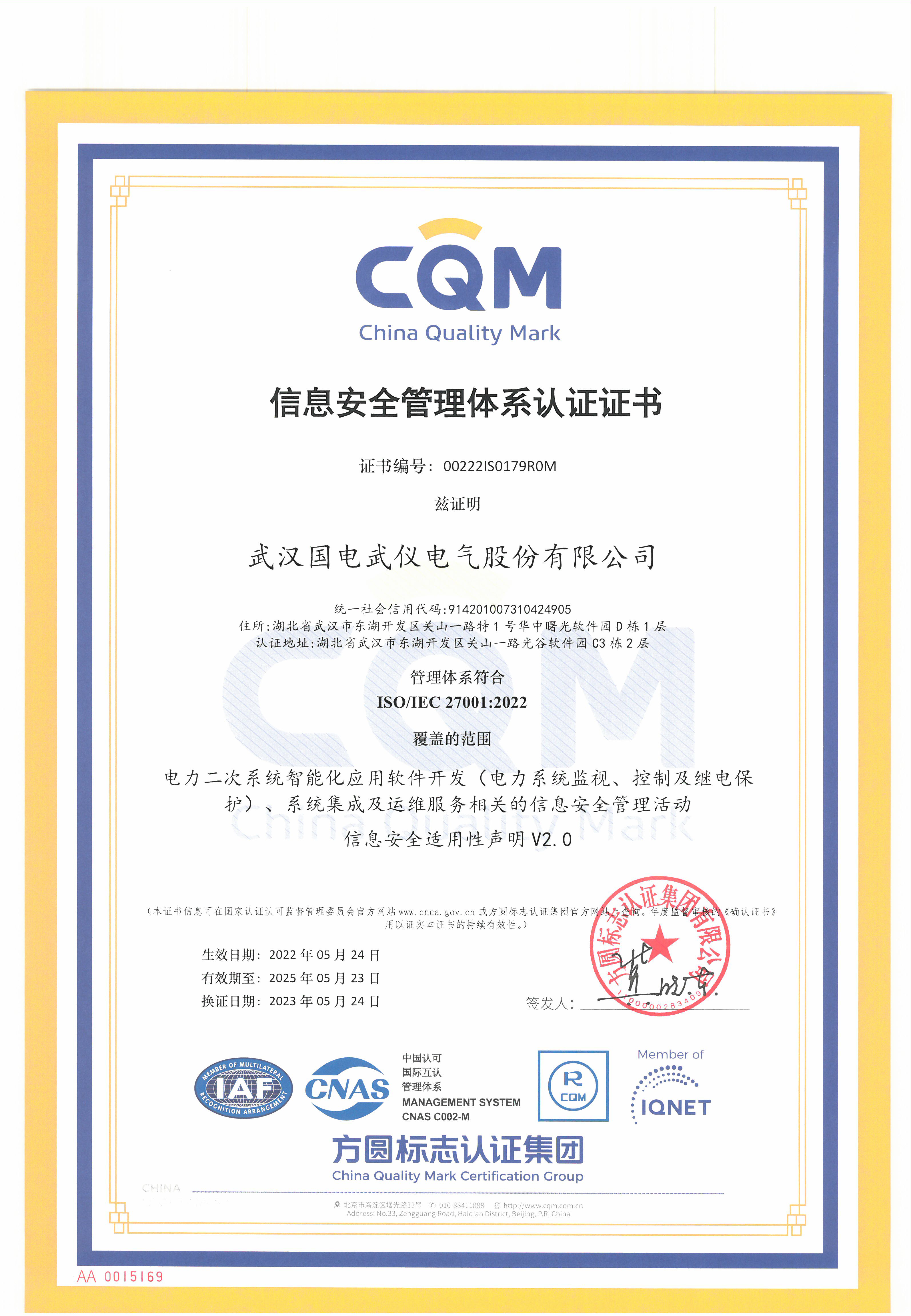 近日,方圆标志认证集团为武汉国电武仪电气股份有限公司颁发了首张带有CNAS认可标志的ISO/IEC 27001:2022信息安全管理体系认证证书。