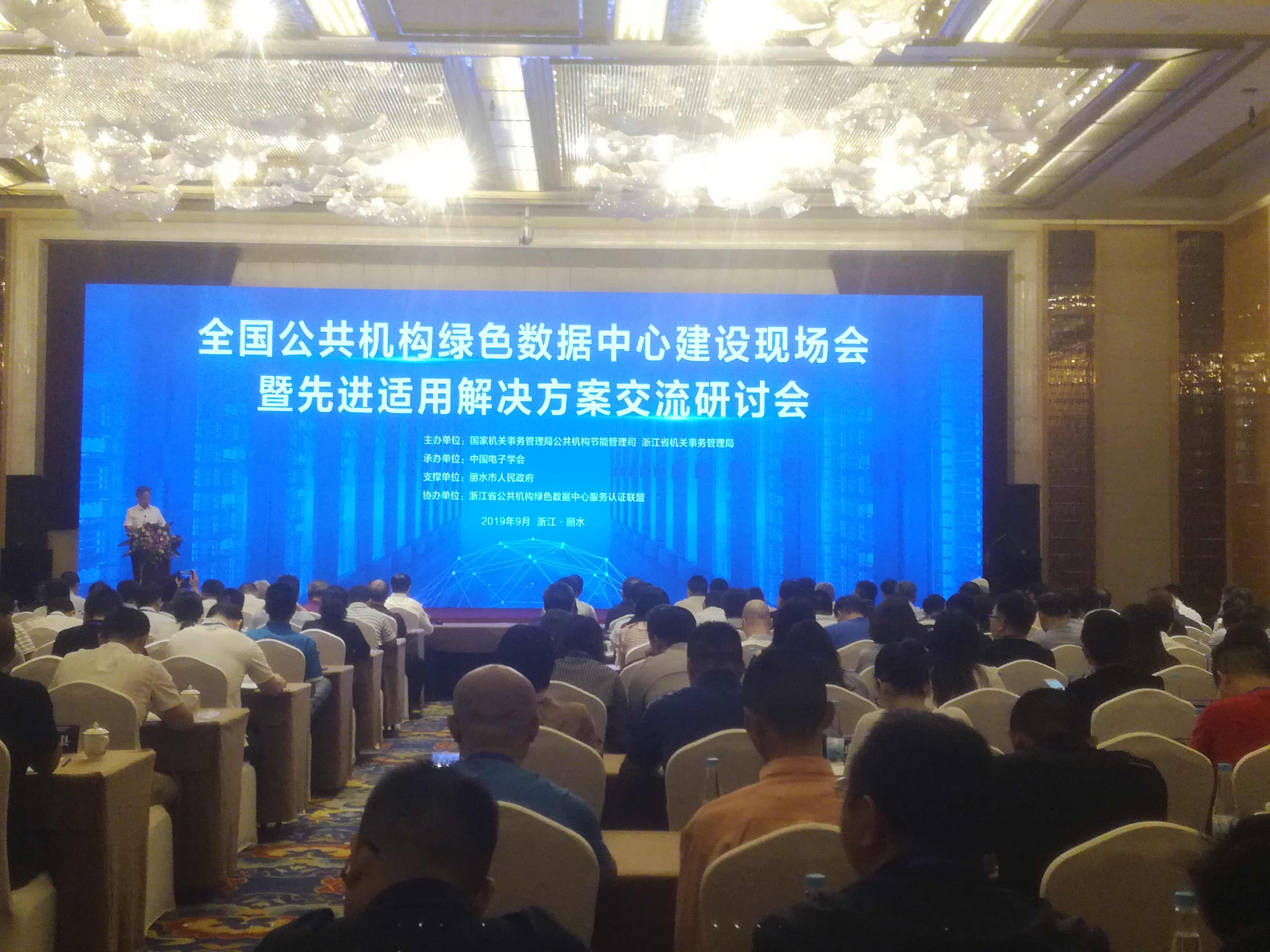 时间:2019年09月29日 9月25日,全国公共机构绿色数据中心建设现场会暨先进适用解决方案交流研讨会在浙江省丽水市召开。会议由国家机关事务管理局公共机构节能管理司洪波副司长主持,国家机关事务管理局公共机构节能管理司、国家市场监督管理总局认证监督管理司、工业和信息化部节能与综合利用司、全国各省市公共机构节能管理部门负责人、中国电子学会、浙江省公共机构绿色数据中心华体会(中国)联盟机构、绿色数据中心技术机构代表等300余人参加本次会议。方圆浙江公司作为公共机构绿色数据中心副理事单位受邀参加。