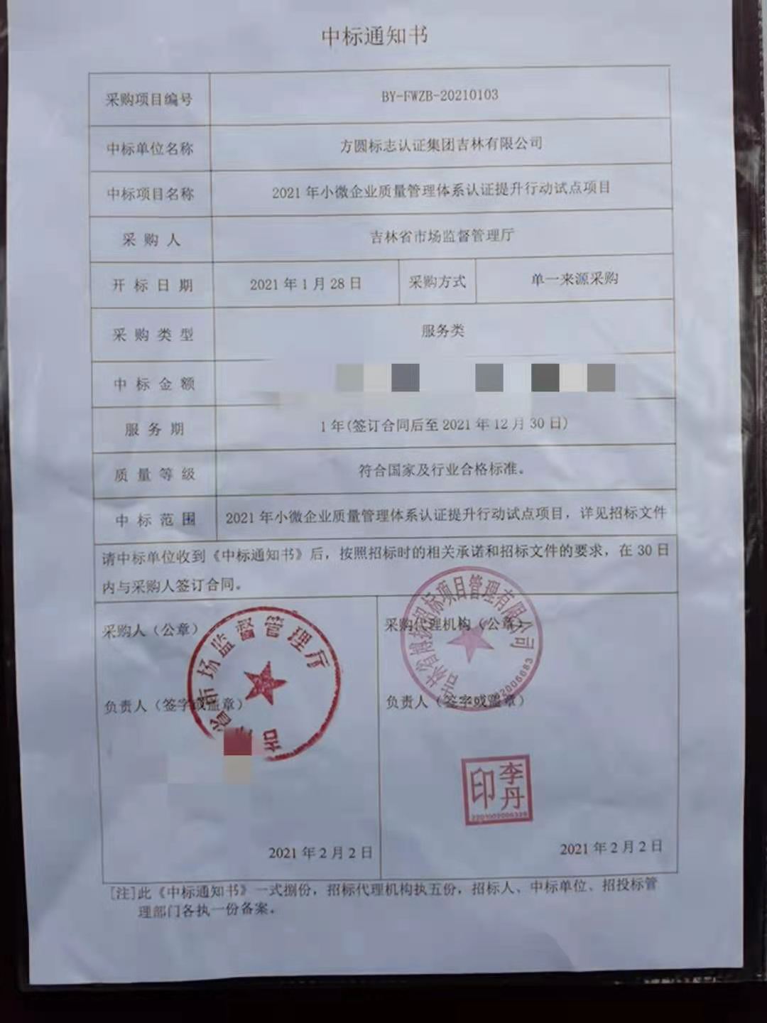 方圆吉林公司成功中标吉林省市场监管厅2021年度吉林省小微企业质量管理体系认证提升行动试点服务项目