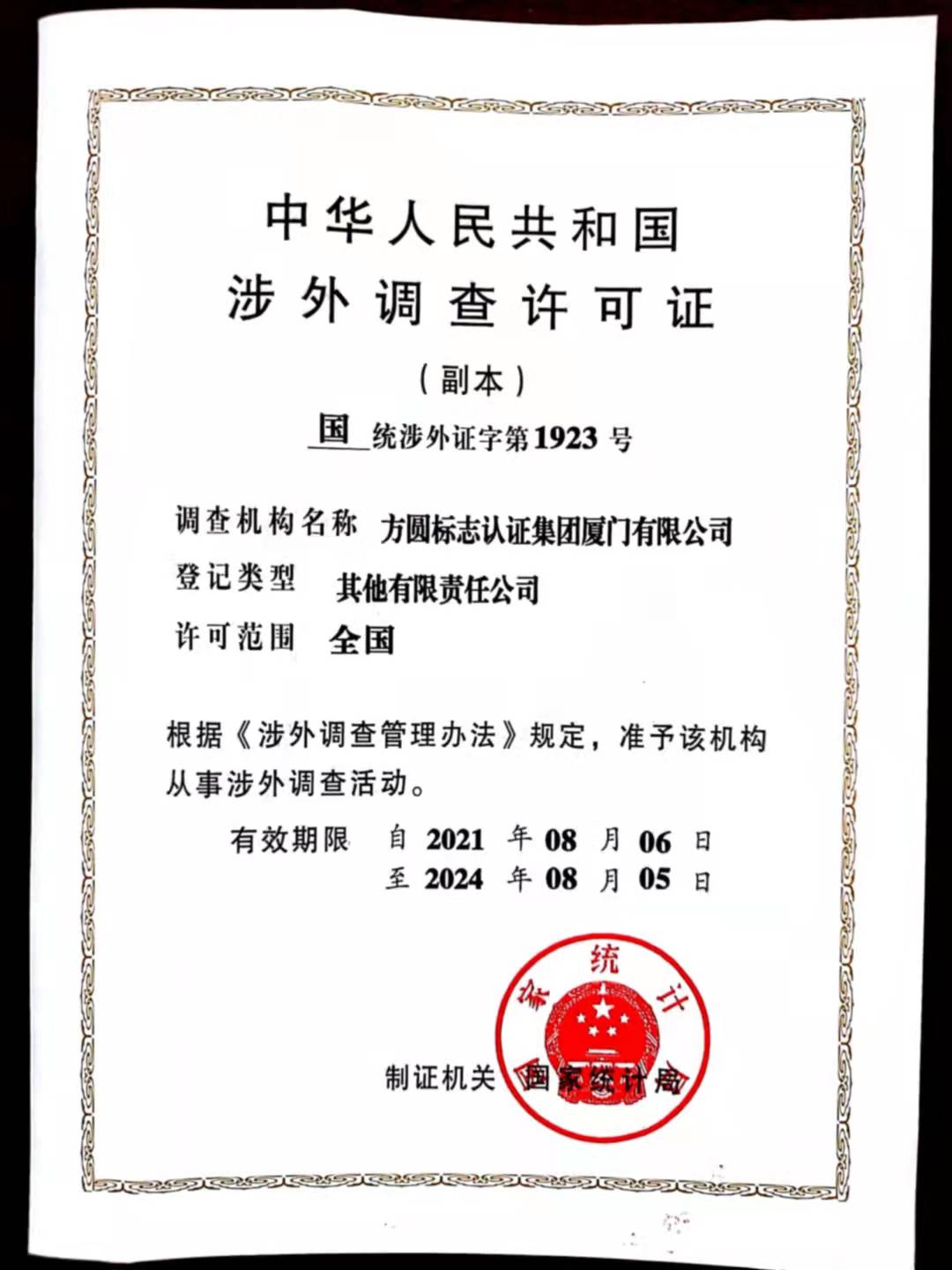方圆厦门公司喜获涉外调查许可证