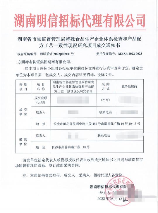 方圆湖南公司成功中标湖南省市场监督管理局特殊食品生产企业体系检查和产品配方工艺一致性现况研究项目
