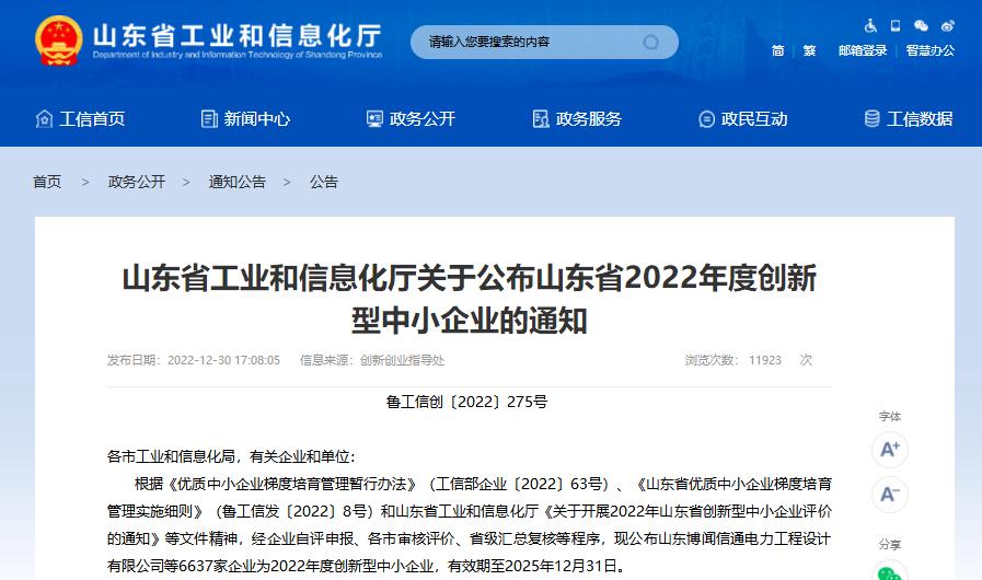 时间:2023年01月03日 近日,根据《优质中小企业梯度培育管理暂行办法》(工信部企业〔2022〕63号)、《山东省优质中小企业梯度培育管理实施细则》(鲁工信发〔2022〕8号)和山东省工业和信息化厅《华体会在线开展2022年山东省创新型中小企业评价的通知》等文件规定,经企业自评申报、各市审核评价、省级汇总复核等程序,山东省工业和信息化厅公布了山东省2022年度创新型中小企业的名单,方圆标志认证集团山东有限公司被认定为山东省2022年度创新型中小企业。