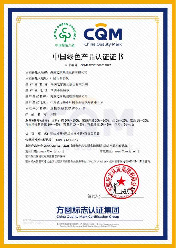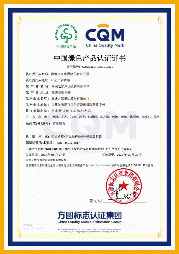 近日,方圆江苏公司向海澜之家集团股份有限公司颁发《中国绿色产品认证证书》,获证产品共计两个产品单元:非直接接触皮肤纺织产品和直接接触皮肤纺织产品,这是无锡市首张纺织行业绿色产品认证证书。